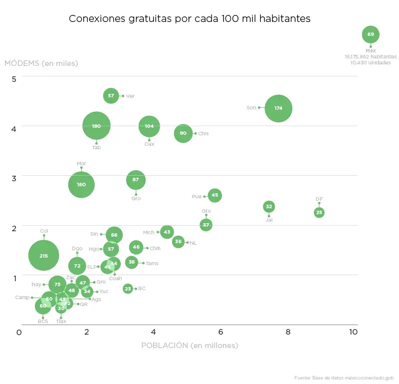 En cambio, si se considera la cantidad de puntos de acceso sin tomar en cuenta a cantidad de población de cada entidad, el Estado de México sería el lugar del país con más puntos de acceso de internet gratuito (10,430), seguido por los estados de Sonora (4,622), Veracruz (4,329), Tabasco (4,030) y Oaxaca (3,986).