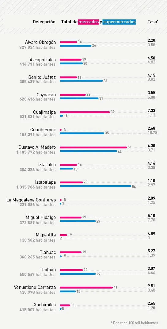 Los mercados públicos generan alrededor de 280 mil fuentes de trabajo. Esta red de 328 establecimientos suma más de 70 mil locales en las 16 delegaciones del DF, y ofrecen calidad, frescura, variedad de productos en lugares cercanos a la población en general. Por otra parte, las tiendas de autoservicio, ofrecen horarios amplios (8 am a 10 pm, en general) un mayor número de productos, lugares de estacionamiento, limpieza y seguridad. De los 677 comercios en el Distrito Federal, 48.45% son mercados públicos, mientras que el 51.55% restante son supermercados. De acuerdo con los datos estadísticos (Laboratorio de Datos) las delegaciones Gustavo A. Madero, Venustiano Carranza y Cuajimalpa de Morelos agrupan el 40% de los mercados públicos en el DF, mientras que Iztapalapa, Gustavo A. Madero y Cuauhtémoc contienen el 38.15% de los supermercados de la Ciudad de México.