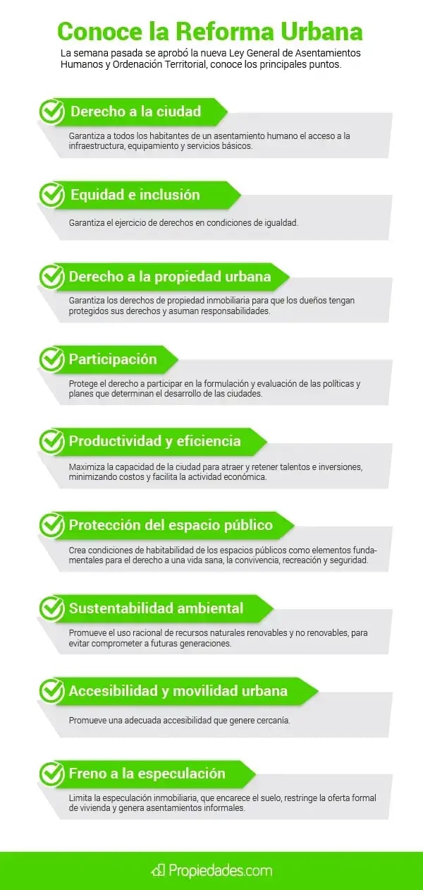 Arquitectura y UrbanismoEn México, alrededor del 67 por ciento de los asentamientos humanos es irregular, ante esto, la nueva Ley General de Asentamientos Humanos y Ordenación Territorial define los criterios para otorgar permisos de construcción, el uso de suelo y la certeza en transacciones para frenar la informalidad, coincidieron expertos consultados por el portal inmobiliario Propiedades.com.