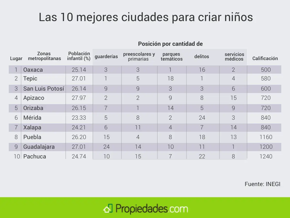 Para obtener esta lista se tomaron en cuenta las zonas metropolitanas con más de 400,000 habitantes y se consideraron cinco variables: el número de guarderías, escuelas primarias y preescolares; la cantidad de parques temáticos; los índices delictivos y los servicios médicos.A cada elemento se le asignó un valor de 20%, por lo que sumado nos da un total de 100%. Toda la información se obtuvo con las cifras más actualizadas del INEGI. Algunas de ellas, como la población, se obtuvieron de la Encuesta Intercensal 2015.