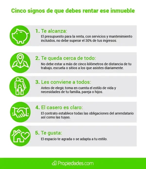 5. Te gusta mucho Es básico rentar un espacio que te agrade o que puedas adaptar fácilmente a tu estilo. “Si encontraste el lugar que te gustó y que te alcanza, no lo pienses mucho. Réntalo, la demanda es alta y te pueden ganar”, señaló Cancino.