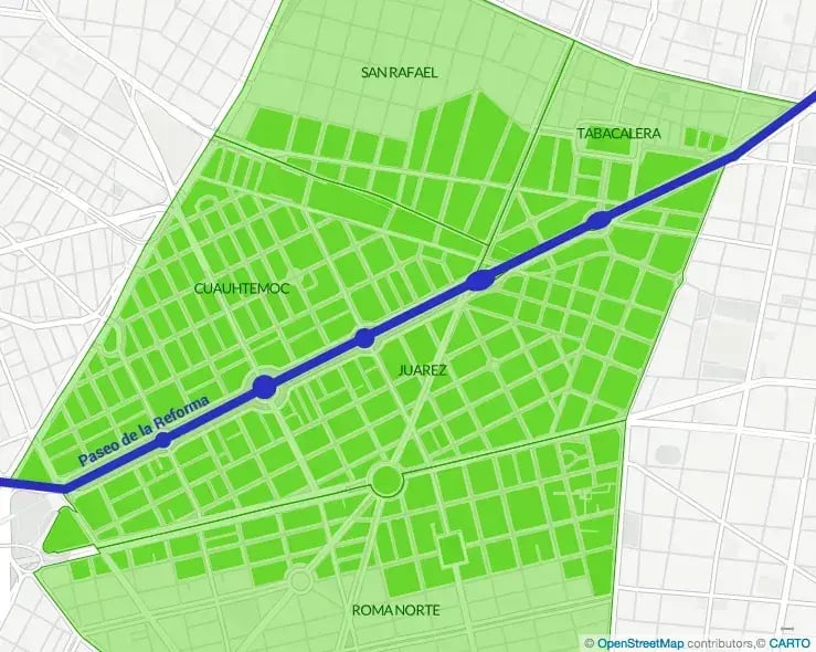 Para el análisis, Propiedades.com revisó las colonias que se ubican en un radio de 1 kilómetro de Paseo de la Reforma. En total, 7 colonias arrojaron datos, pero sólo 4 cuentan con una muestra representativa en el portal: Juárez, Roma Norte, San Rafael y Tabacalera.