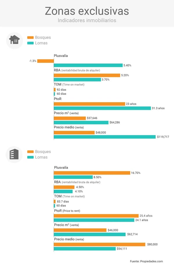 En cuanto a departamentos, en Bosques, el RBA es de 4.5 por ciento, con precios de 46,000 pesos por metro cuadrado y 80,000 pesos mensuales por alquilar. En las Lomas, estos inmuebles generaron un RBA de 4.1 por ciento, con precios de 62,714 pesos mensuales por metro cuadrado y 54,111 al mes por alquilar.