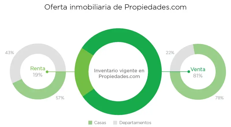 De la oferta vigente en la sección de venta, el 78% corresponde a casas. Esto se debe a que en el inventario de Propiedades.com abundan las casas tipo residencial y residencial plus, aunque también existen propiedades anunciadas de otras clasificaciones.