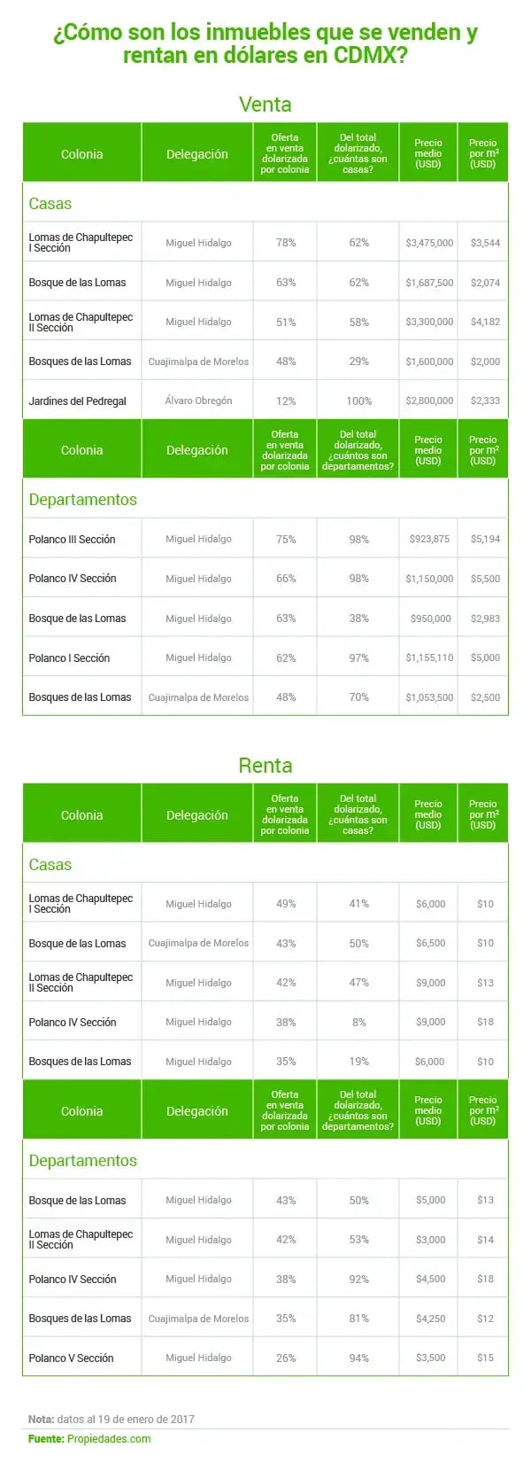 Información InmobiliariaLa oferta de inmuebles que cotizan en dólares en la Ciudad de México está concentrada en Polanco, Bosque de las Lomas, Bosques de las Lomas y Lomas de Chapultepec, con precios de venta que superan los 3 millones de dólares, mientras que las rentas ascienden hasta 9 millones de dólares. A continuación te presentamos las colonias que tienen más inmuebles que cotizan en dólares en la capital del país: